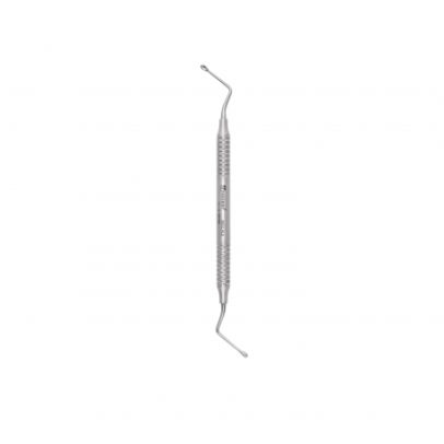 Double-ended Hemingway Bone Curette is a debulking instrument used in small bone and periodontal procedures. It features oval, cupped tips with sharp edges used to scrape away bone fragments. Handle 8 mm.