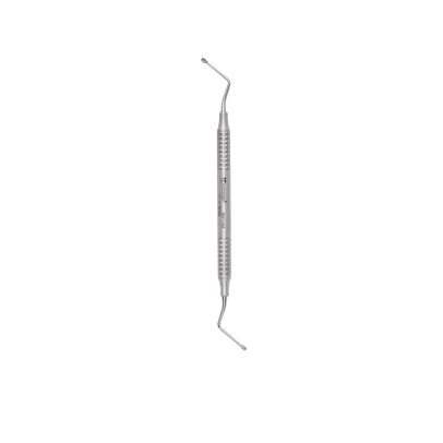 Double-ended Hemingway Bone Curette is a debulking instrument used in small bone and periodontal procedures. It features oval, cupped tips with sharp edges used to scrape away bone fragments. Handle 8 mm.