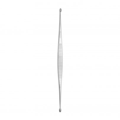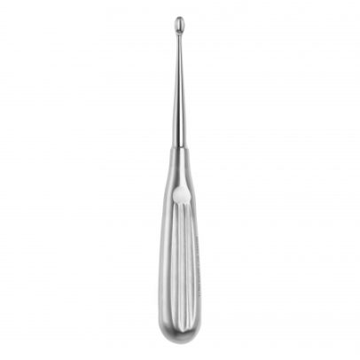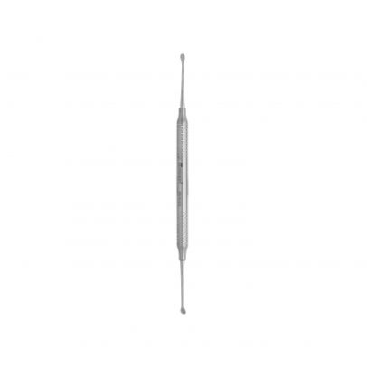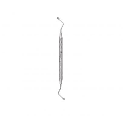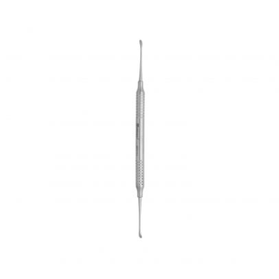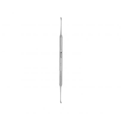 Spoon shape Double-ended Miller Bone Curette is a debulking instrument used in small bone and periodontal procedures. It features oval, cupped tips with sharp edges used to scrape away bone fragments. Handle 8 mm.
